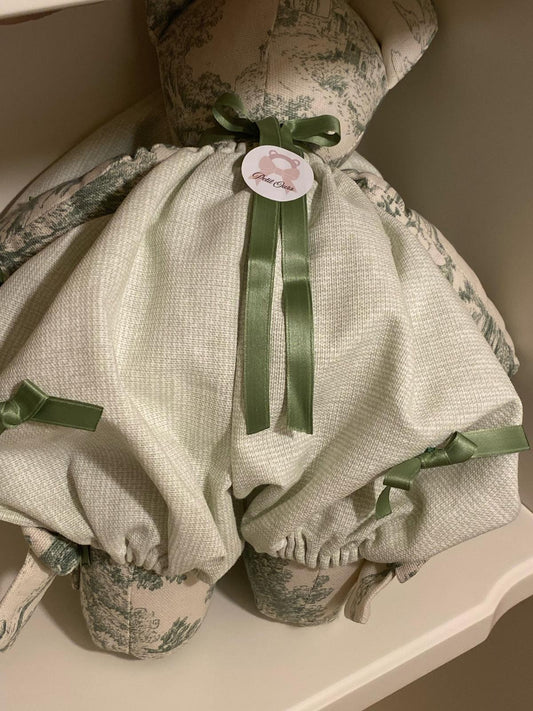 Orsetto artigianale Toile de Jouy verde 40 cm con doppio fiocco e coulotte in cotone