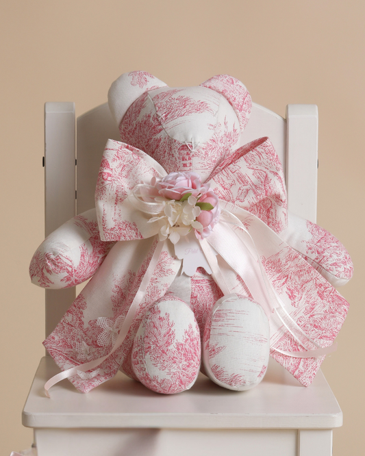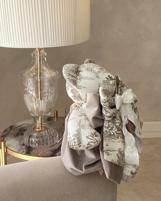 Orsetto Toile de Jouy tortora 45 cm con doppio fiocco in velluto e coulotte coordinata