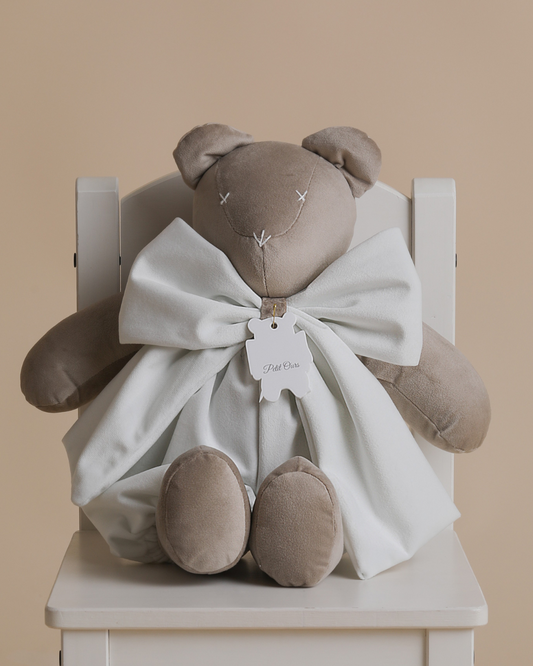 Hai dato un'occhiata al nostro Orsetto di velluto? È una vera chicca, eleganza senza tempo. Disponibile in due colori, vestito con coulutte e fiocco.