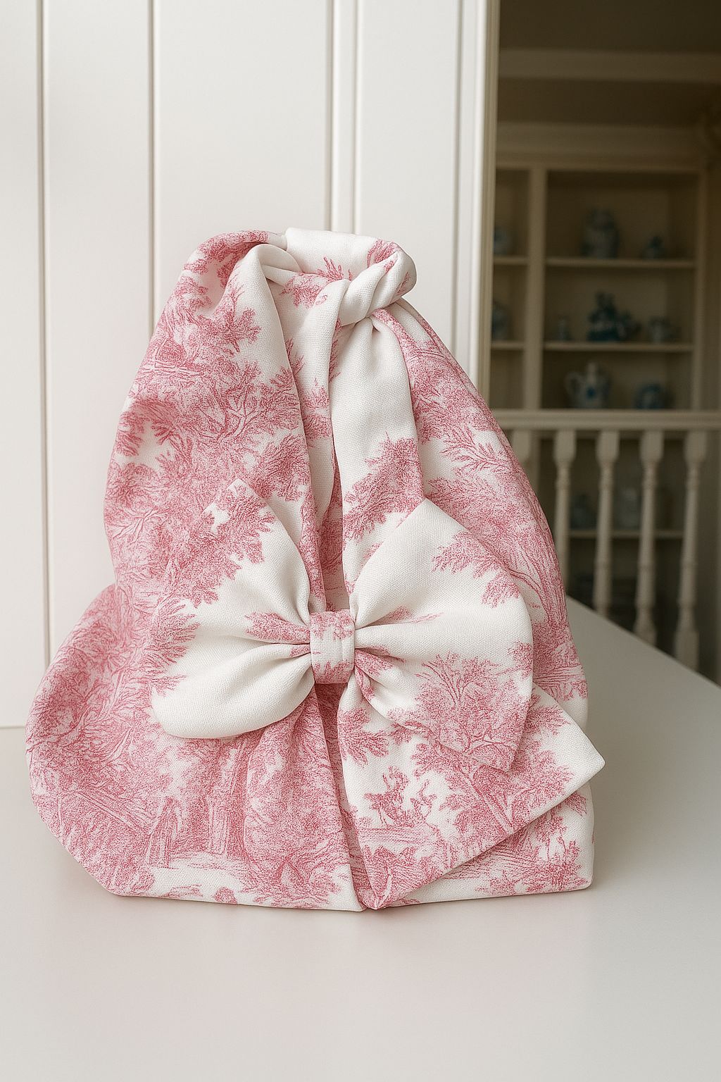 Elegante, romantica e sostenibile, questa borsa artigianale è realizzata con la tecnica giapponese del furoshiki, un antico metodo di piegatura e annodatura dei tessuti. Il tessuto scelto è una raffinata toile de Jouy rosa antico su fondo avorio, caratterizzata da delicati motivi pastorali che richiamano l’estetica francese del XVIII secolo. Il grande fiocco centrale, realizzato con la stessa stoffa, aggiunge un tocco femminile e sofisticato, rendendola perfetta sia come accessorio moda che come confezione regalo ecologica.