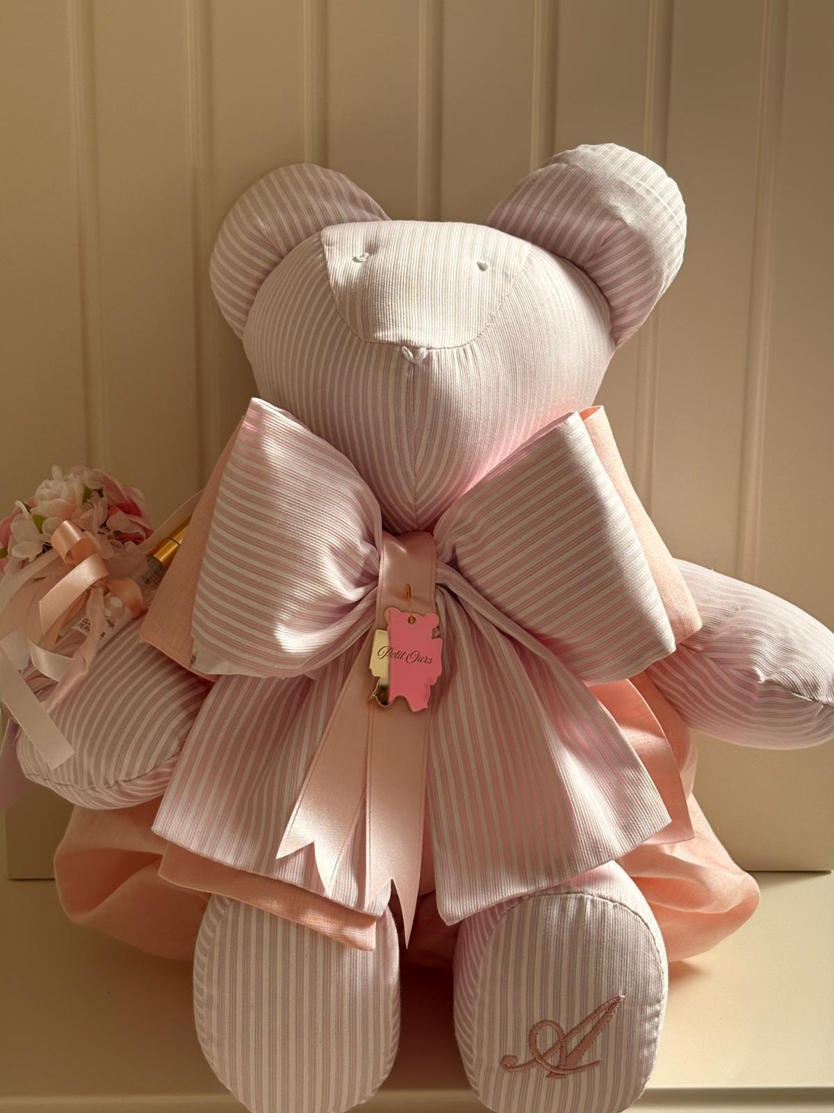Un raffinato orsetto artigianale realizzato in tessuto a righe rosa e bianche, impreziosito da un maxi fiocco coordinato e dettagli sartoriali curati nei minimi particolari. L’iniziale ricamata “A” aggiunge un tocco personalizzato e unico. Un accessorio dolcissimo, ideale come regalo nascita, decorazione per la cameretta o simbolo d’amore fatto a mano. Ogni orsetto porta con sé l’etichetta firmata Petit Ours, garanzia di qualità e passione artigiana.